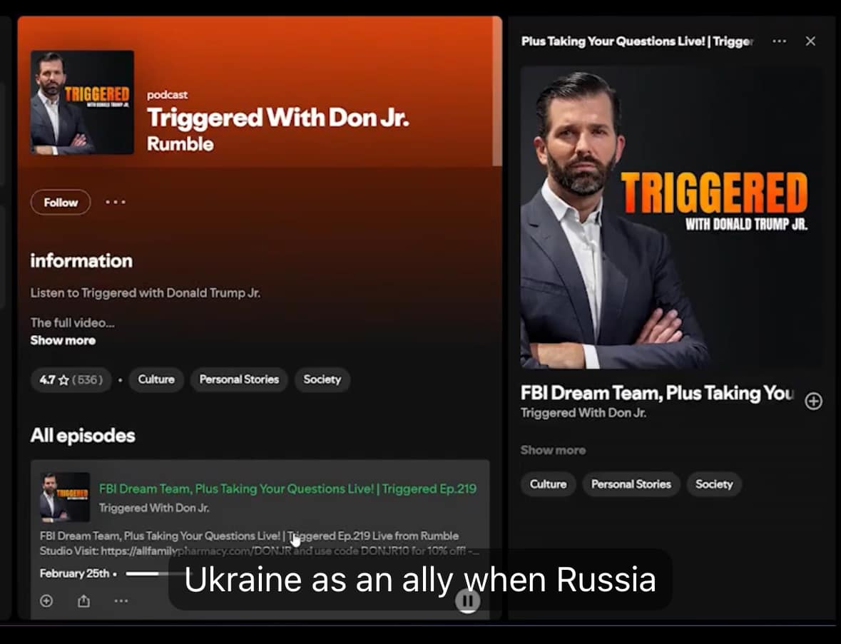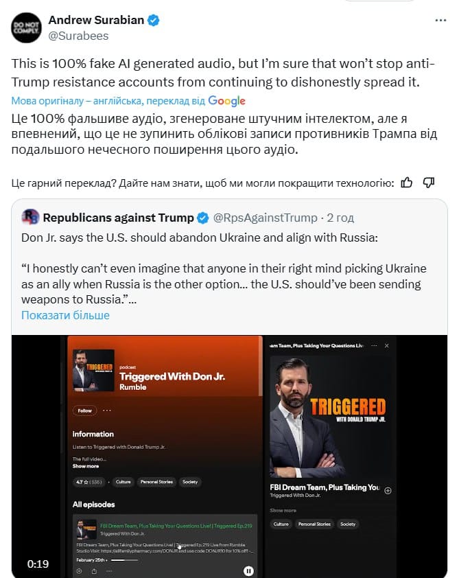 В сети активно распространяли якобы "фрагмент" из подкаста сына американского лидера Дональда Трампа-младшего, в котором тот вроде как говорит об Украине, в частности о поддержке. Однако после проверки оказалось, что этот фрагмент не существует вообще.