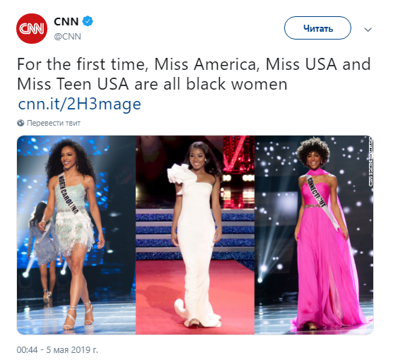 В США впервые в истории победительницами всех трех главных конкурсов красоты - "Мисс США", "Мисс Америка" и "Мисс Тинейджер США" - стали темнокожие конкурсантки.