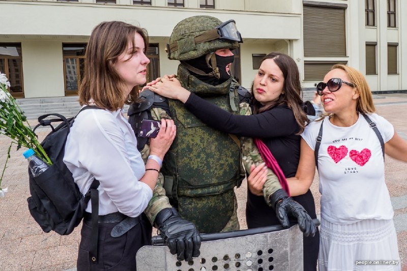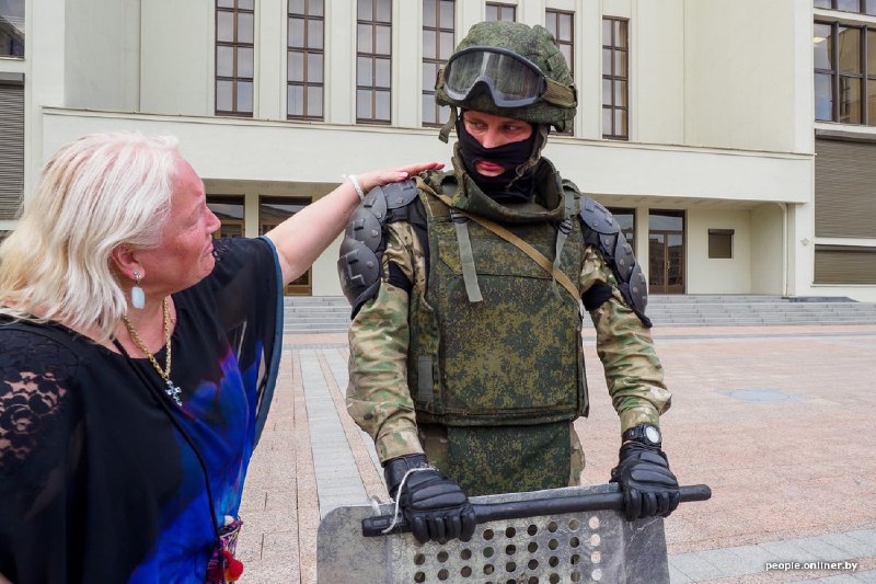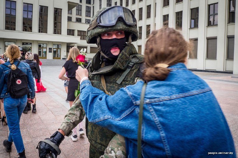 Люди уточняли у силовиков, до какого времени можно стоять. Человек в форме отвечал: "Стойте сколько хотите". По словам корреспондента белорусского издания, силовики дали слово офицера, что, если не будет никаких провокаций, они не применят силу первыми. Между участниками акции и силовиками расстояние примерно в десять метров.
