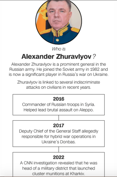 Приказ сбрасывать на мирных жителей Украины кассетные бомбы отдавал генерал-полковник Александр Журавлев, для которого подобные зверства не в новинку. Ранее именно он руководил одной из самых жестоких российских операций в сирийской войне.