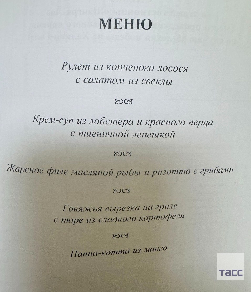 "На горячее им предложили жареное филе масличной рыбы и ризотто с грибами, а также говяжью вырезку на гриле из пюре из сладкого картофеля. Как десерт - панна-котта из манго", - говорится в сообщении.