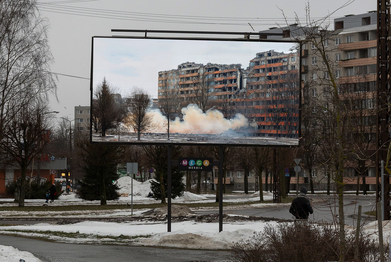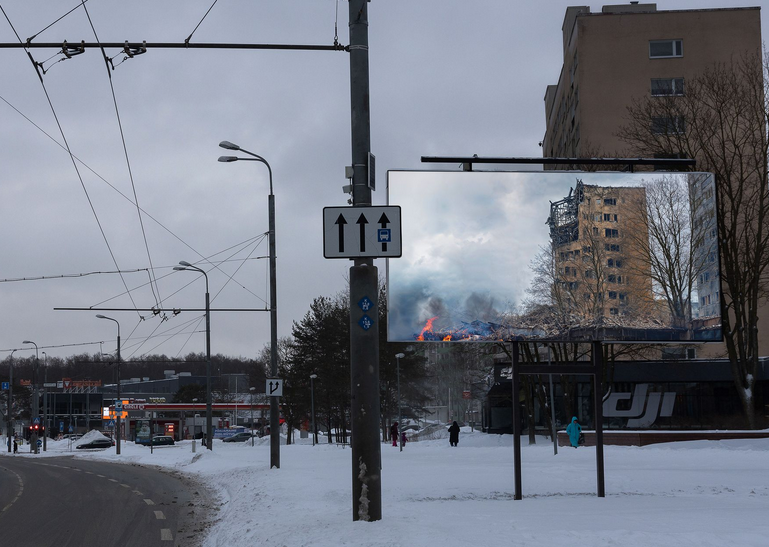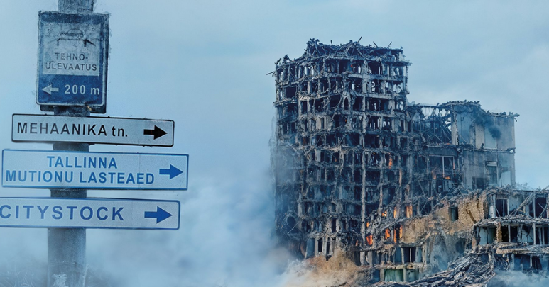 В Эстонии художники создали шокирующие билборды с изображениями Таллина в руинах, напоминая о том, что война может дойти до Европейского Союза.