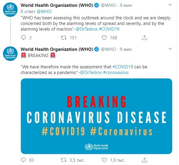 ВОЗ объявила пандемию коронавируса COVID-19, которым по данным на среду, 11 марта, по всему миру заразились 118 тысяч человек, умерли более 4 тысяч.