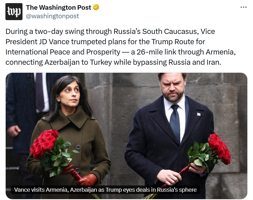"В ходе двухдневного турне по Южному Кавказу России вице-президент Соединенных Штатов Джей Ди Венс объявил о планах по Маршруту Трампа для международного мира и процветания — 26-мильной соединительной линии через Армению, которая соединит Азербайджан с Турцией, обходя Россию и Иран".