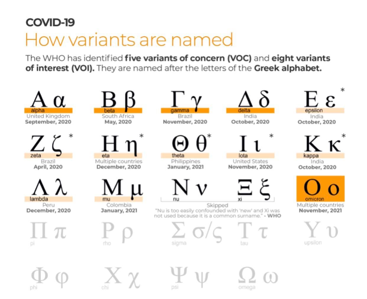 Мутации обозначаются буквами и цифрами. ВОЗ определила пять летучих органических соединений и восемь представляющих интерес вариантов (VOI). С мая 2021 года они носят названия букв греческого алфавита, начинающихся с альфы.