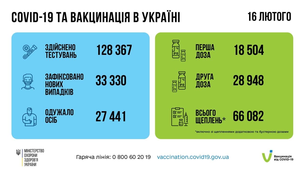 В Украине за прошлые сутки, 16 февраля, зафиксировано 33 330 новых подтвержденных случаев коронавирусной болезни COVID-19 (из них детей – 2 837, медработников – 961).