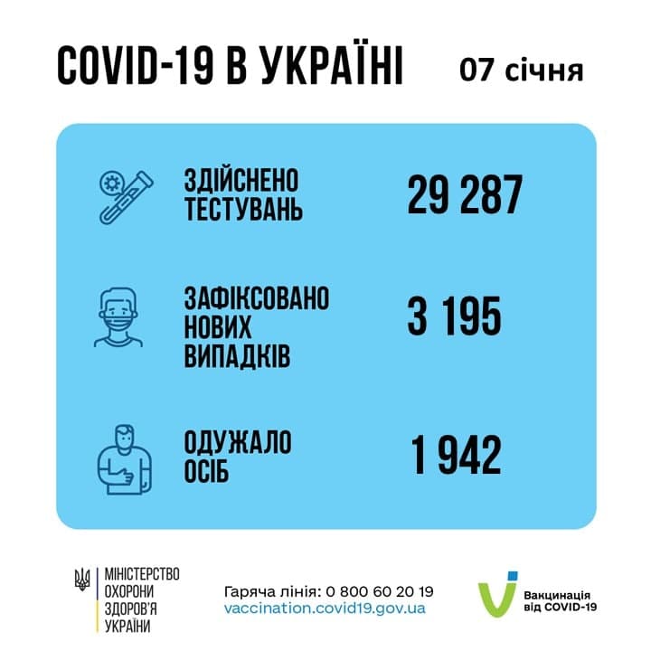 В Украине за минувшие сутки, 7 января, зафиксировано 3 195 новых подтвержденных случаев коронавирусной болезни COVID-19 (из них детей – 151, медработников – 37);
