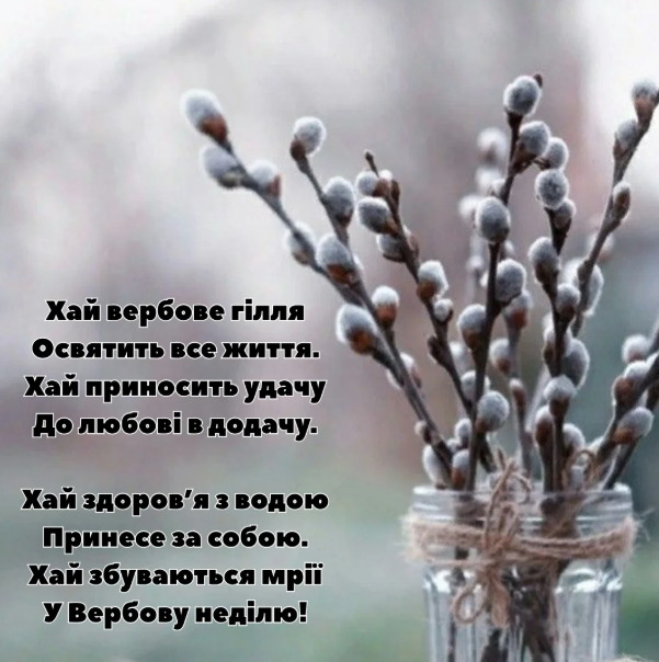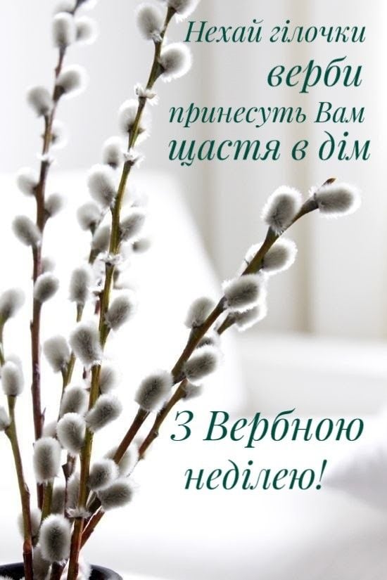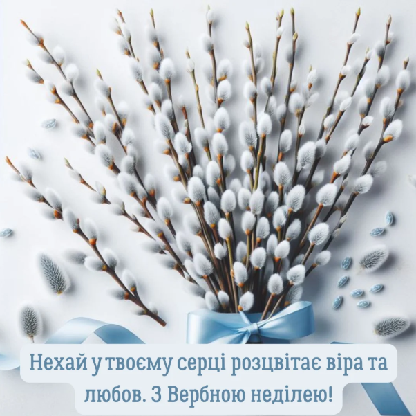 Вітаю з Вербною неділею! Нехай освячена верба принесе у ваш дім мир, добробут і Божу благодать. Нехай серце наповнюється вірою, а душа — світлом.