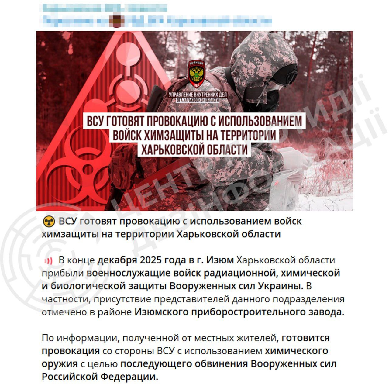 Там зазначили, що російські телеграм-канали розповсюджують чергову фейкову інформацію про нібито прибуття підрозділів радіаційного, хімічного та біологічного захисту ЗСУ до Ізюма й підготовку "теракту", під час якого будуть використані хімічні речовини у період з 6 по 8 січня.