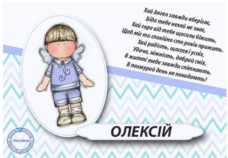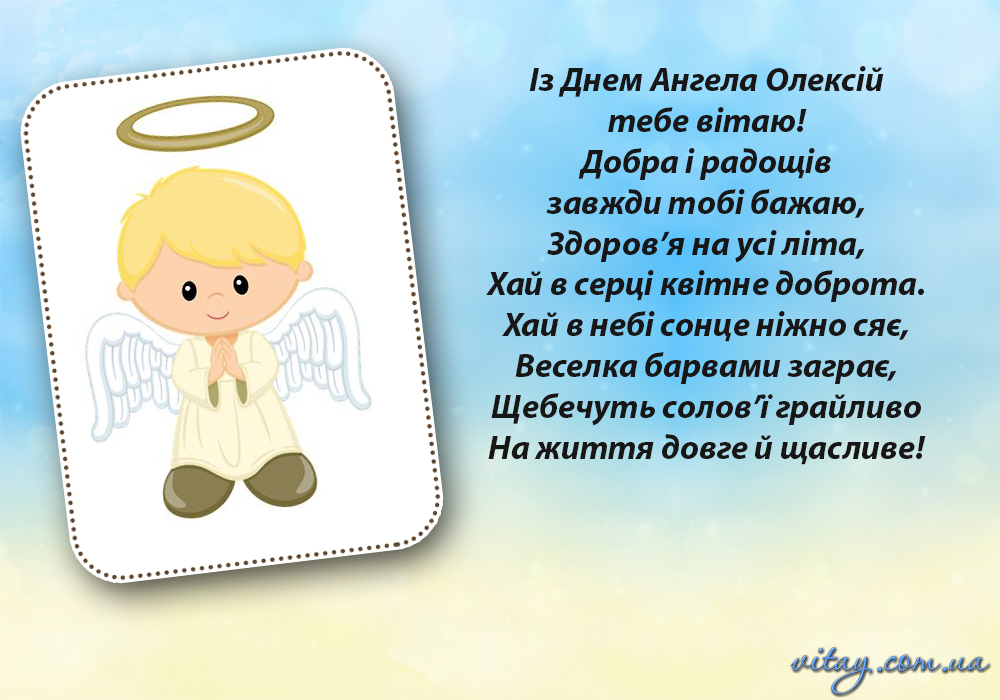 Дорогий мій Олексій, вітаю тебе від щирого серця! Хочу тобі побажати, щоб ти по життю завжди залишався захисником, як визначено долею твого імені: захисником своїх рідних, захисником своїх ідей і своїх досягнень, своєї любові і свого щастя. Будь впевнений у собі, шалено щасливий і успішний!