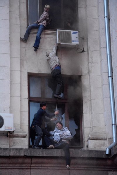 "Ці всі проросійські елементи сховалися, це важко сказати, вони зайшли у будівлю і почали звідти жбурляти "коктейлі Молотова", почали стріляти у громадян і так далі. Більшість тих "коктейлів Молотова" розбивались прямо в будівлі. Це не був свідомий підпал. Вони підпалювали самі себе. Ми як самооборона прийняли для себе важке рішення і ми робили все можливе, аби врятувати громадян, які фактично у палаючій будівлі знаходяться", – коментує Дмитро