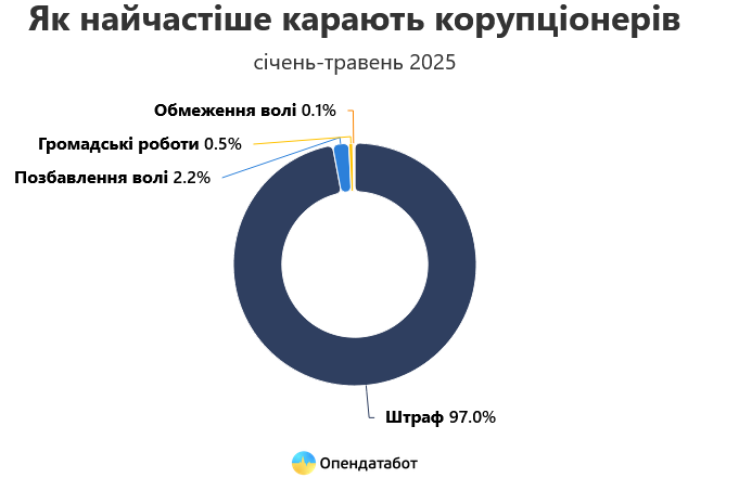 В Україні з початку року у 97% випадків корупційних справ фігуранти отримали штрафи, тоді як вироки з реальним позбавленням волі отримали лише 44 особи (3%).