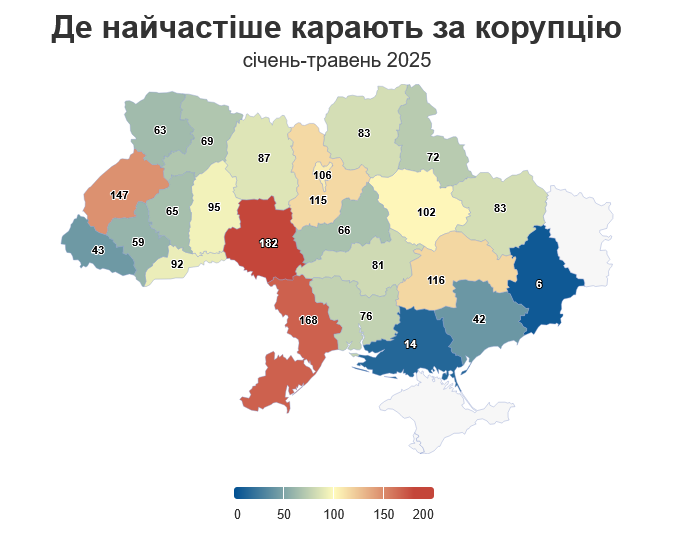 Найактивніше виносили покарання за корупційні правопорушення суди у Вінницькій області – 182 рішення (9% від загалу). На другому місці Одеська область – 168 рішень, на третьому місці йде лідерка минулих років – Львівська область із 147 рішеннями.