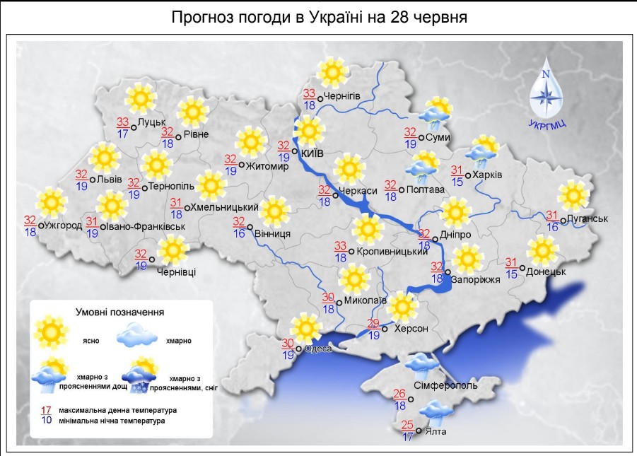 Так, у вівторок вдень температура повітря сягатиме +30...+33 градусів, в Криму +23...+28°; вночі від +16 до +19°, у східних областях, Карпатах та на Прикарпатті +12...+17°.
