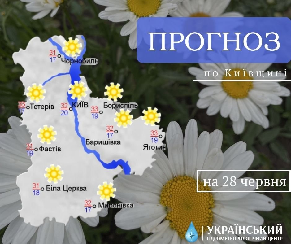 У Києві та області 28 червня - без опадів. У столиці температура вночі становитиме близько +20°, а вдень +31...+33°. На Київщині температура вночі буде на рівні +16...+21°, вдень +29...+34°.