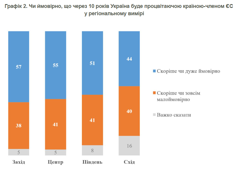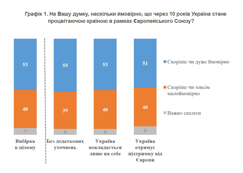 "Загалом 53% вважають скоріше чи дуже ймовірним, що через 10 років Україна буде процвітаючою країною-членом ЄС. Вважають це скоріше чи зовсім малоймовірним – 40%".