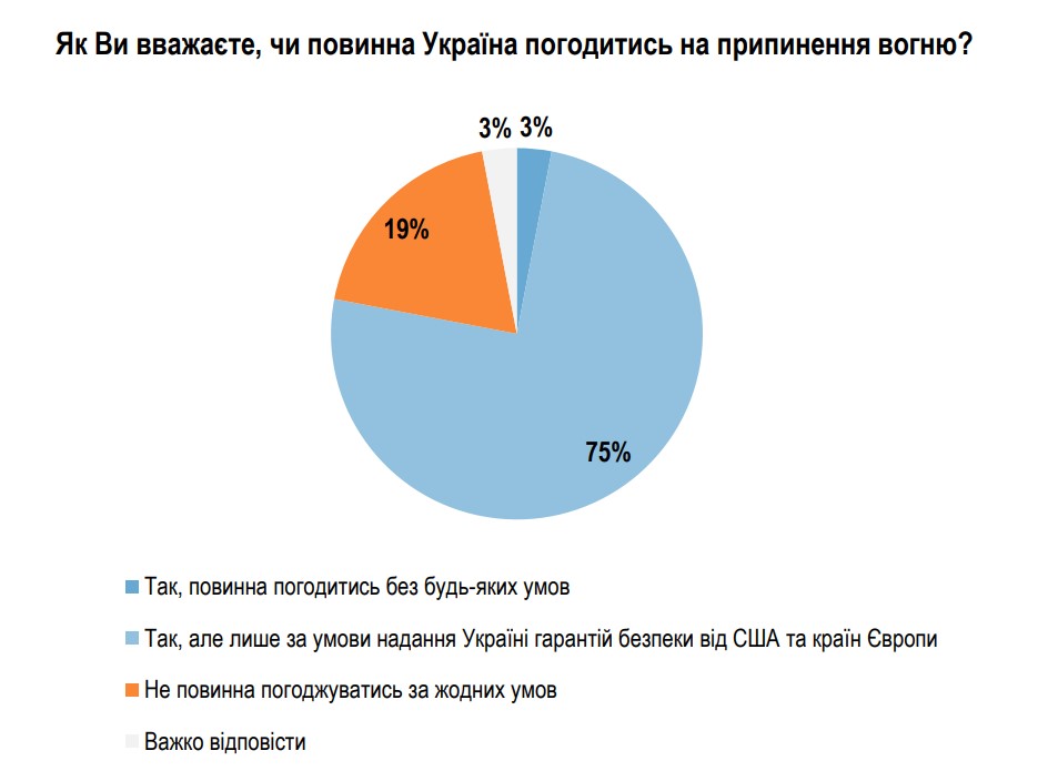 На питання "Чи повинна Україна погодитись на припинення вогню?" 75% відповіли "Так, але лише за умови надання Україні гарантій безпеки від США та країн Європи", 19% – "Не повинна погоджуватись за жодних умов", ще 3% вважають, що Україна повинна погодитися на припинення вогню без будь-яких умов, і 3% не змогли відповісти.