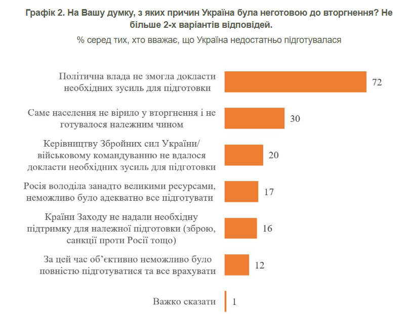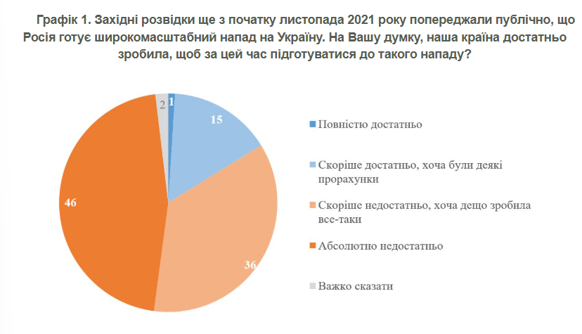 За його результатами, 46% опитаних вважають, що Україна була абсолютно не готова до вторгнення, ще 36% вважають, що дещо було зроблено, але все-таки переважно недостатньо. Лише 16% респондентів відповіли, що підготовка була достатньою.