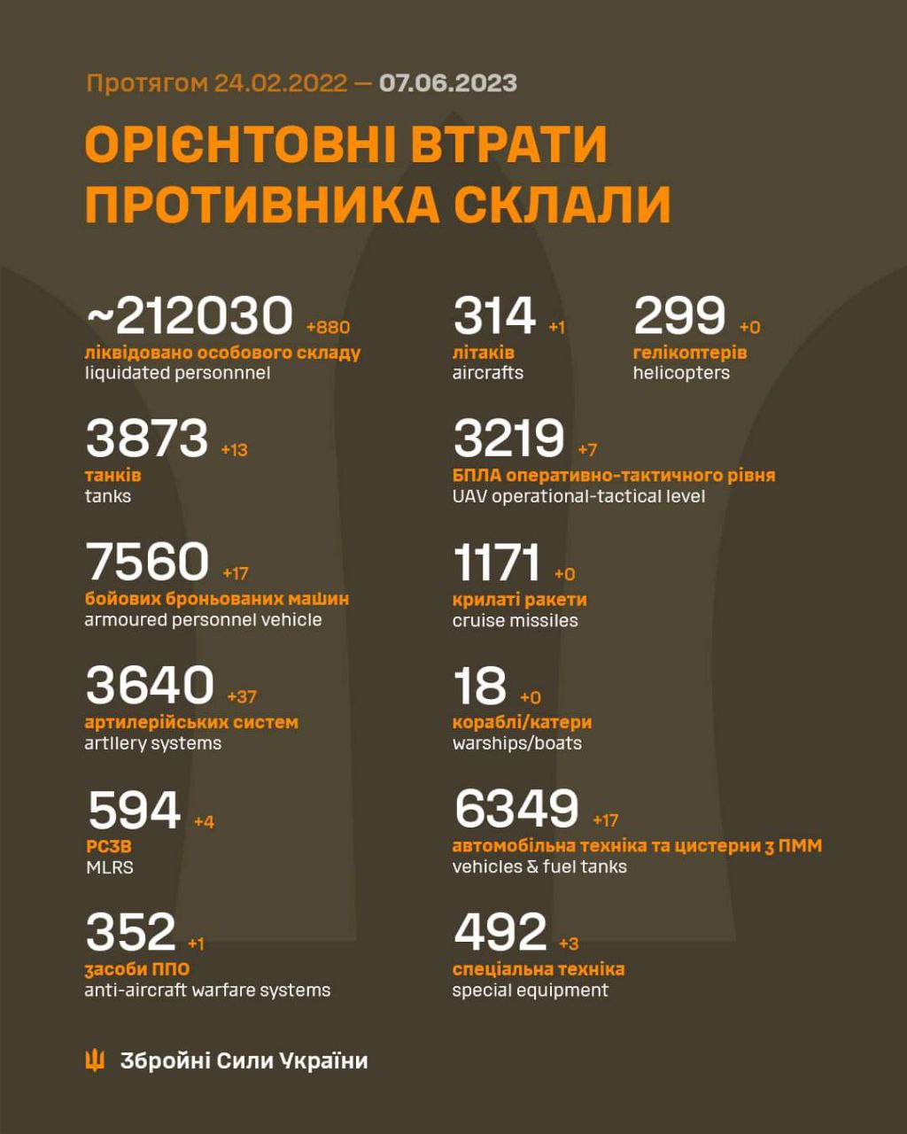 Російська армія, яка зазнала колосальних втрат під Бахмутом, з 24.02.22 по 07.06.23 втратила вже 212030 особового складу. За добу ліквідовано 880 окупантів.