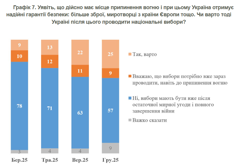 Переважна більшість громадян України продовжує виступати за проведення виборів лише після завершення війни та укладення остаточної мирної угоди. Станом на грудень 2025 року, лише 9% опитаних вважають, що виборчий процес необхідно розпочинати до припинення вогню.