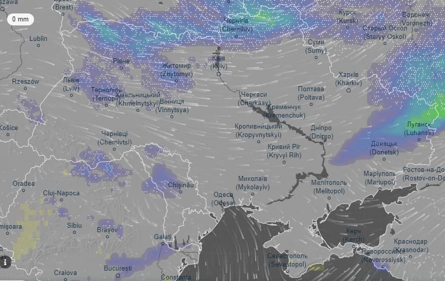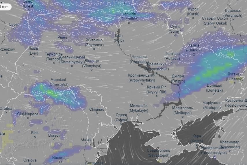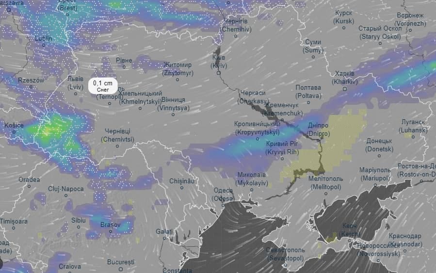 Сніг іде у Харківській, Полтавській, Дніпропетровській, Кіровоградській, Миколаївській, Чернівецькій, Львівській, Рівненській, Чернігівській областях. Опади також дісталися Тернопільської та Житомирської областей.