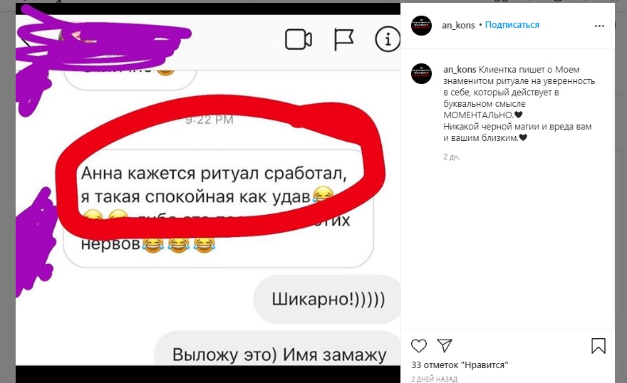 "Клієнтка пише про Мій знаменитий ритуал на впевненість в собі, який діє в буквальному сенсі моментально. Ніякої чорної магії і шкоди вам і вашим близьким", - написала Анна.