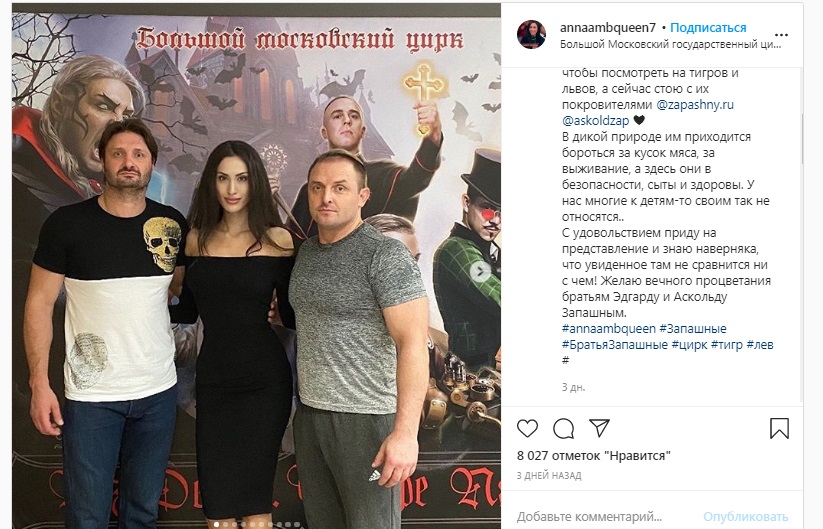"Хижаки їх поважають - це результат правильного Виховання, що адекватні люди розуміють під словом" дресирування ". Ще в дитинстві Я обожнювала ходити в цирк переважно заради того, щоб подивитися на тигрів і левів, а зараз стою з їх покровителями @ zapashny.ru @ askoldzap. У дикій природі їм доводиться боротися за шматок м'яса, за виживання, а тут вони в безпеці, ситі і здорові. У нас багато хто до дітей своїх так не ставляться ", - написала вона.