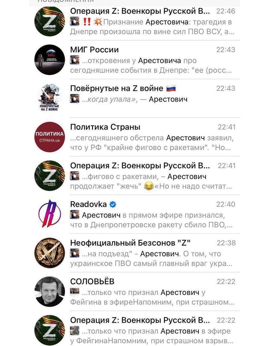 Слова Арестовича одразу поширилися у пропагандистських російських телеграм-каналах, однак варто зауважити, що він не висловлював офіційну позиції України.