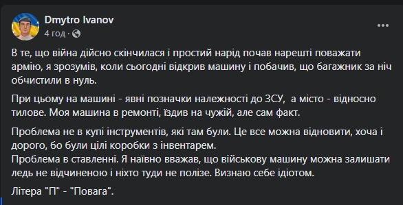 "Моя машина в ремонті, їздив на чужій, але сам факт. Проблема не в купі інструментів, які там були. Це все можна відновити, хоча і дорого, бо були цілі коробки з інвентарем. Проблема в ставленні. Я наївно вважав, що військову машину можна залишати ледь не відчиненою і ніхто туди не полізе. Визнаю себе ідіотом. Літера "П" - "Повага", - написав Іванов.