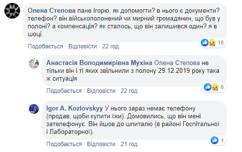 "Як нам допомогти? У нього є документи, телефон? Він військовополонений чи мирний громадянин, був у полоні? А компенсація? Як сталося, що він залишився один? Я в шоці", - написала користувач Олена Степова.