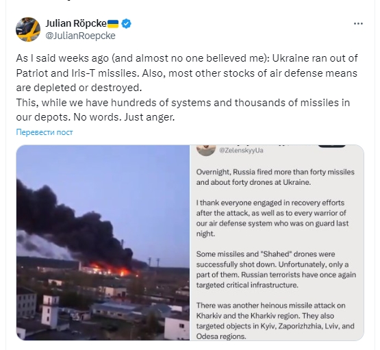 Згідно з інформацією журналіста, в Україні закінчилися запаси ракет до Patriot та Iris-T. Крім того, за його словами, виснажено чи знищено більшість інших запасів засобів ППО.
