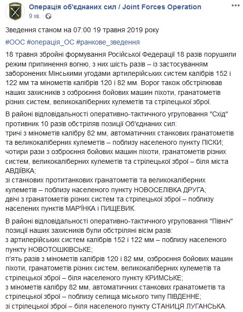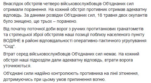 Внаслідок обстрілів четверо військовослужбовців ООС отримали поранення. При цьому, як зазначили в зведенні, на кожен обстріл противник отримав адекватну відповідь. Зокрема, як повідомляє військова розвідка, 18 травня двох окупантів було знищено, ще трьох – поранено.