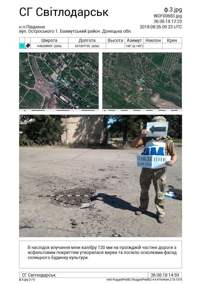 "25 серпня 2018 російсько-терористичні війська обстріляли з міномета калібру 120 мм житловий сектор селища Південне Бахмутського району Донецької області. Повідомлення про обстріл надійшло о 10.00 26 серпня. На місці події представниками СЦКК було виявлено воронку від вибуху 120 мм міни на асфальтованій проїжджої частини вулиці Островського, 1 осколками цієї міни був пошкоджений фасад будинку культури", - йдеться в повідомленні.