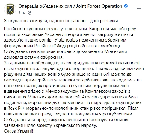 "Агресія супротивника була пригнічена, моральний дух зломлений - в підрозділах окупаційних військ РФ морально-психологічний стан різко погіршився. Після навіювання їм страху, окупанти почуваються розгубленими. Об'єднані сили продовжують стійко виконувати бойові завдання щодо захисту українського народу", - додали в Штабі.
