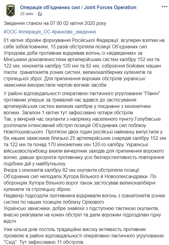 Для припинення ворожих обстрілів українські захисники використовували чергові вогневі засоби. З початку цієї доби російські окупаційні війська вогневої активності не проявляли.