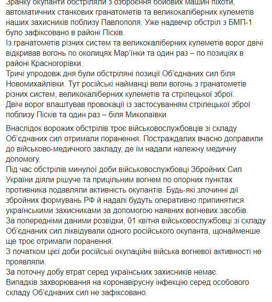 У середу, 1 квітня, бойовики 15 раз обстріляли позиції українських військових на Донбасі, троє бійців Збройних сил України (ЗСУ) отримали поранення.
