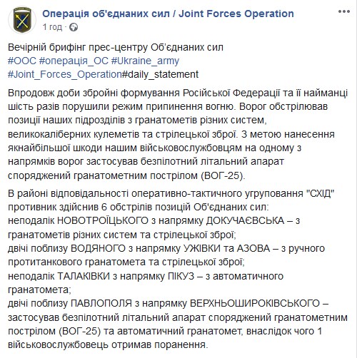 Окрім того, "з метою нанесення якнайбільшої шкоди" солдатам ВСУ, ворог застосував безпілотний літальний апарат споряджений гранатометним пострілом (ВОГ-25). В результаті обстрілу один військовий отримав поранення.
