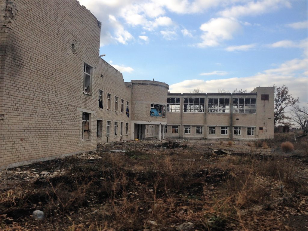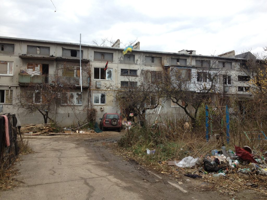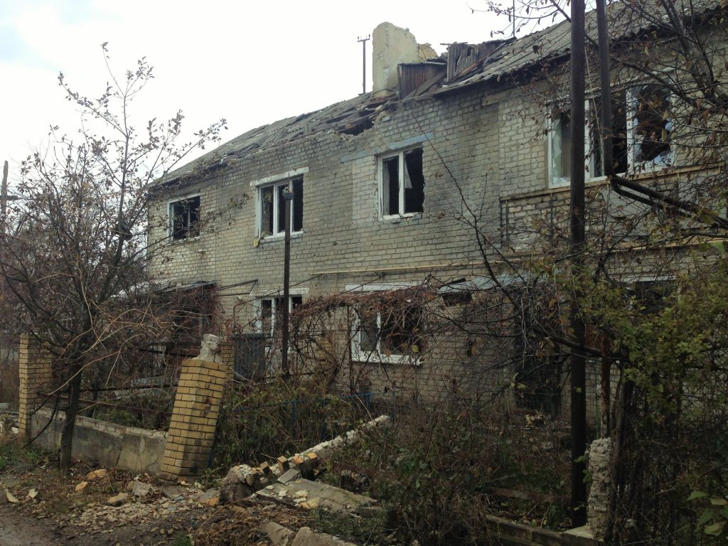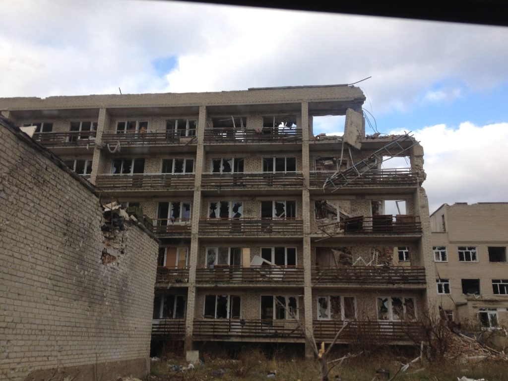 Водночас, приблизно в 500 метрах від центру, на околиці міста панує повна розруха: зруйновані снарядами будинки з квартирами, будівля інтернату.