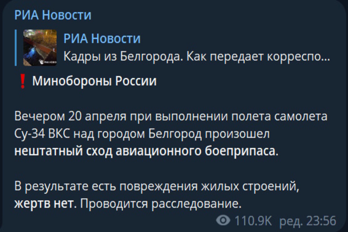 У четвер увечері, 20 квітня, в російському Білгороді стався сильний вибух, в результаті якого утворилася величезна вирва. У російському міноборони визнали, що це був "дружній вогонь".