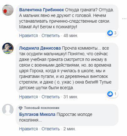 "В одній з київських шкіл на Троєщині учневі стало нудно на уроці, і він кинув на підлогу навчальну гранату. Все це дійство він сам же і зняв на мобільний телефон. На щастя, паніку ніхто не піднімав, але батьків в школу явно запросять", - помітили адміністратори сторінки.