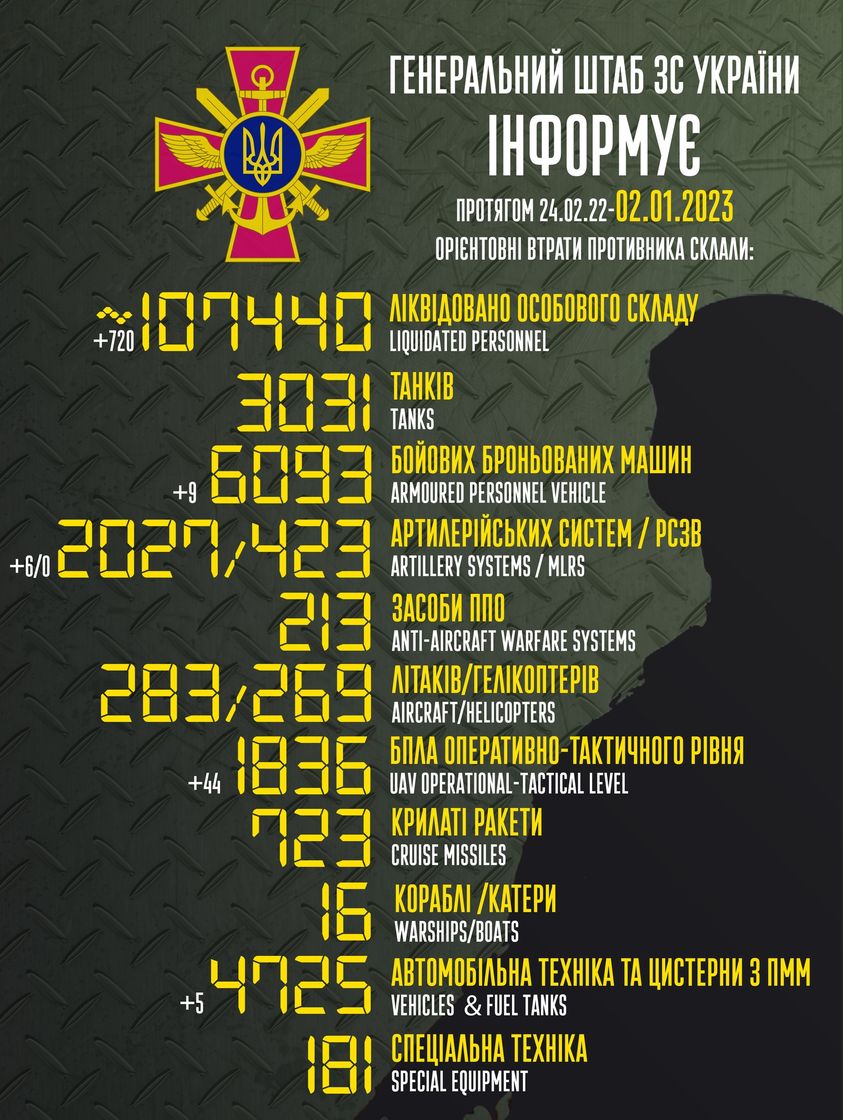 Так, загальні бойові втрати противника з 24.02.22 по 02.01.23 орієнтовно склали: