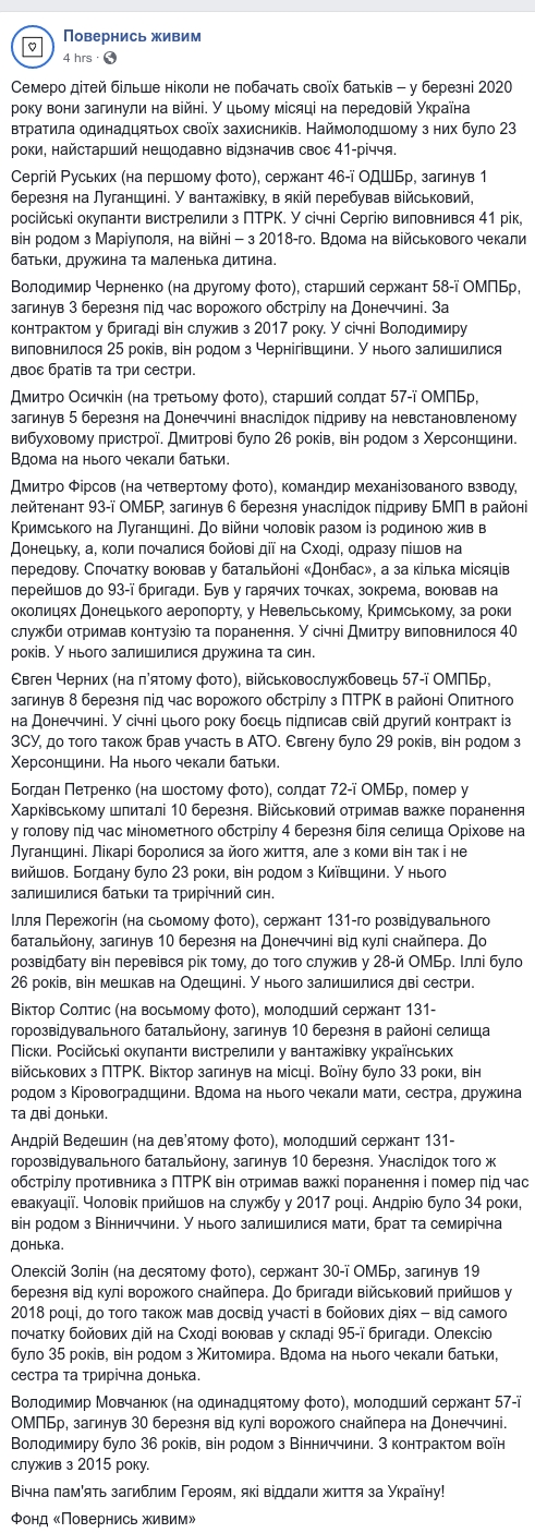 У березні 2020 року на Донбасі загинули 13 захисників України, батьків втратили семеро дітей.