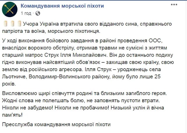 "Україна втратила свого відданого сина, справжнього патріота і воїна, морського піхотинця. В ході виконання бойового завдання в районі проведення ООС, в результаті ворожого обстрілу отримав травми, не сумісні з життям, старший матрос Струк Ілля Миколайович. Він до останнього подиху гідно виконував святійший борг - захищав свою країну, свою землю від російського агресора", - йдеться в повідомленні.