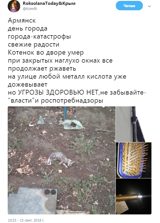 "Армянськ день міста міста-катастрофи свіжі радості. Кошеня у дворі помер при закритих наглухо вікнах все продовжує іржавіти на вулиці будь-який метал кислота вже дожовує, але ЗАГРОЗИ ЗДОРОВ'Ю НІ, чи не забивайте- "влади" і Росспоживнагляд", - не без сарказму пише RoksolanaToday & Крим.