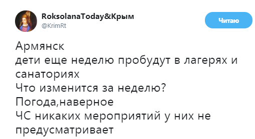 "Армянськ. Діти ще тиждень пробудуть в таборах і санаторіях. Що зміниться за тиждень? Погода, напевно НС ніяких заходів у них не передбачає", - пише вона.