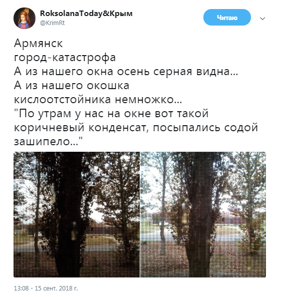 "Армянськ місто-катастрофа. А з нашого вікна осінь сірчана видно ... А з нашого віконця кіслоотстойніка трошки ... "Вранці у нас на вікні ось такий коричневий конденсат, посипалися содою засичало..."", - пише блогер.
