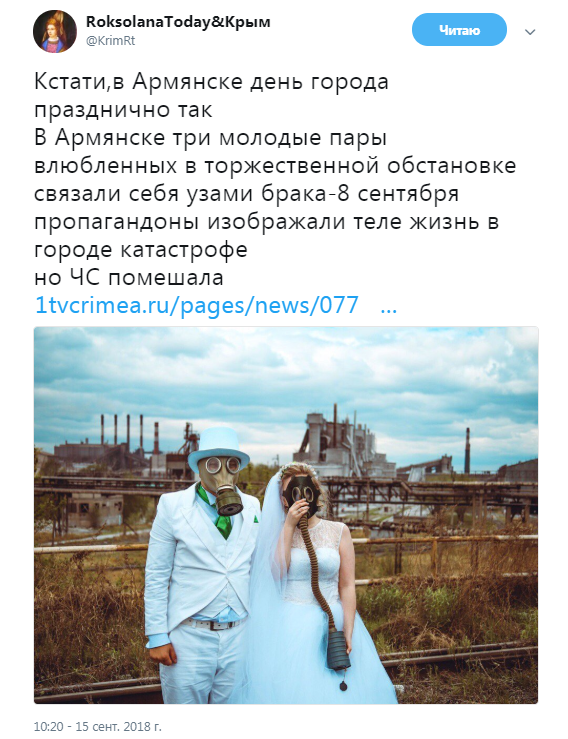 "До речі, в Армянську день міста святково так. В Армянську три молоді пари закоханих в урочистій обстановці пов'язали себе узами шлюбу - 8 вересня пропагандони зображували тілі життя в місті катастрофи, але НС завадила", - йдеться в повідомленні.