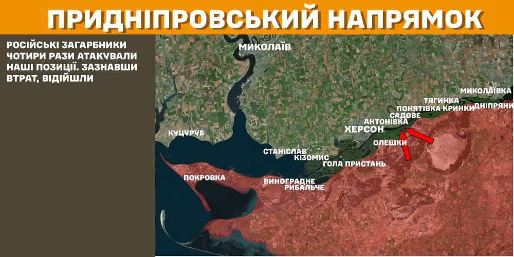 На Придніпровському напрямку російські війська чотири рази атакували українські позиції, однак, зазнавши втрат, були змушені відступити.