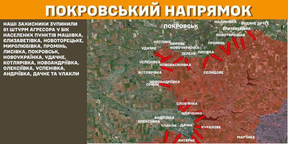 Найбільш запеклі бої точилися на Покровському напрямку, де українські захисники відбили 61 атаку агресора, який намагався прорватися в напрямках Машівки, Єлизаветівки, Новоторецького, Миролюбівки, Променя, Лисівки, Покровська, Новоукраїнки, Удачного, Котлярівки, Новоандріївки, Олексіївки, Успенівки, Андріївки, Дачного та Улаклів.
