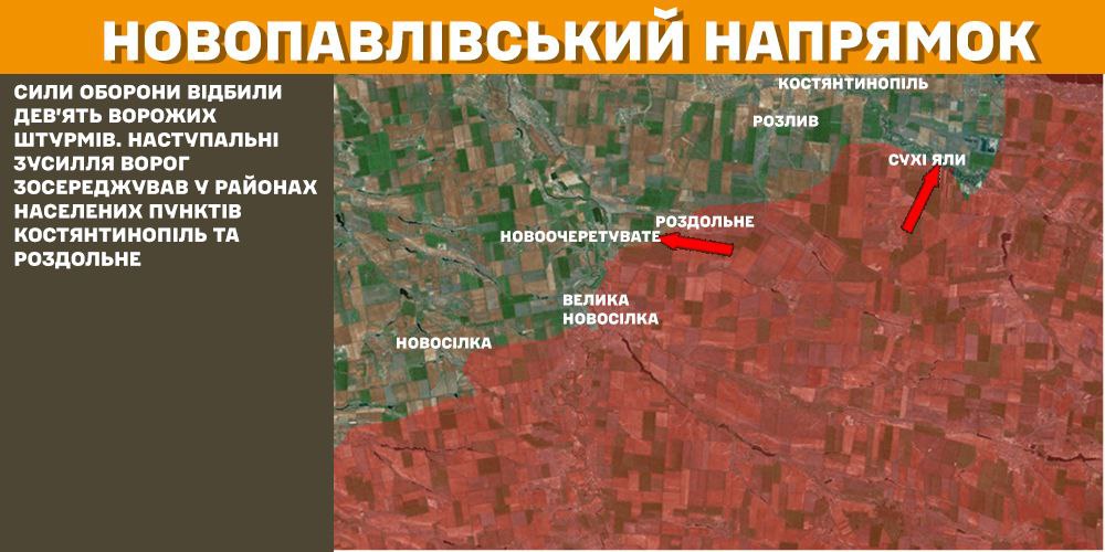 На Новопавлівському напрямку сили оборони відбили дев"ять штурмів у районах Костянтинополя та Роздольного.